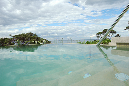 Overlooking Portsea sea shore with views to Melbourne, the infinity edge pool built into the gentle slope of the site, compliments the bay vista. The paved patio area blends seamlessly with the pool surround. An outdoor kitchen including barbeque, fridge, dishwasher, sink and cabinetry is fully concealed when not in use behind bi folding panels which neatly stack away inside the kitchen unit.