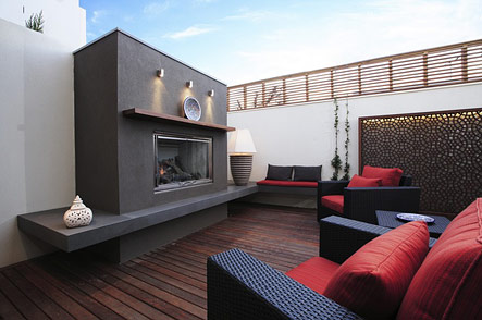 The designed layout including fireplaces both inside and out, will extend the usability of the spaces through the seasonal changes. The external awning has been moulded into the fascia and a blank section of the blind has been used to continue the eave and fascia line, hiding the blind. The backlit rusted geometric screen gives the space a focus both whilst the doors are open or closed, further cementing the integrated spaces.